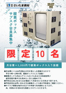 2025.12.05 イベント 酸素ボックス サブスク会員募集開始 2025.12~酸素ボックス使い放題のサブスクリプションを開始いたしました。 会員様は3,000円で一か月間使い放題です!(1日1回90分限度) 一般の方も都度施設利用料1,100円をお支払いいただければサブスク会員登録が可能です。 ご興味のある方はジムまでお問い合わせくださいませ。 048-979-9999 « 一覧をみる »